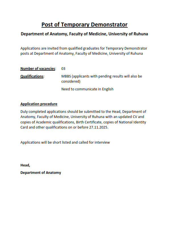 Post of Temporary Demonstrator ,Department of Anatomy, , Faculty of Medicine, University of Ruhuna November 13, 2025