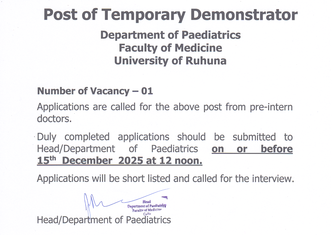 Post of Temporary Demonstrator ,Department of Paediatrics , Faculty of Medicine, University of Ruhuna December 1, 2025