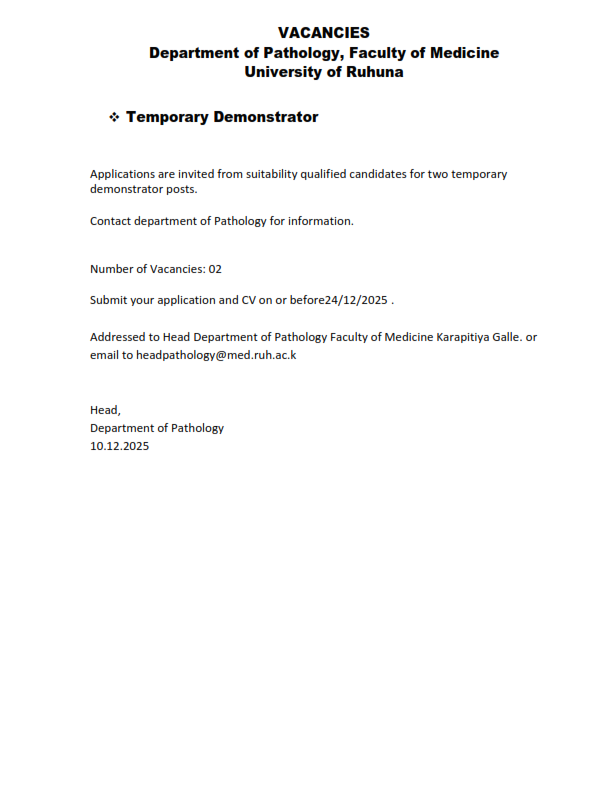 Post of Temporary Demonstrator ,Department of Pathology , Faculty of Medicine, University of Ruhuna