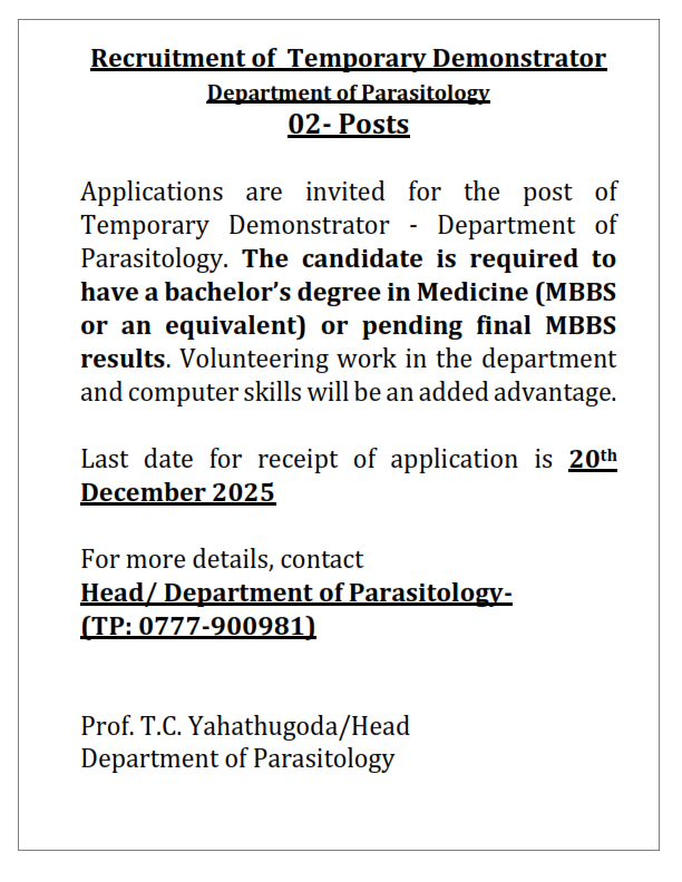 Post of Temporary Demonstrator ,Department of Parasitology , Faculty of Medicine, University of Ruhuna
