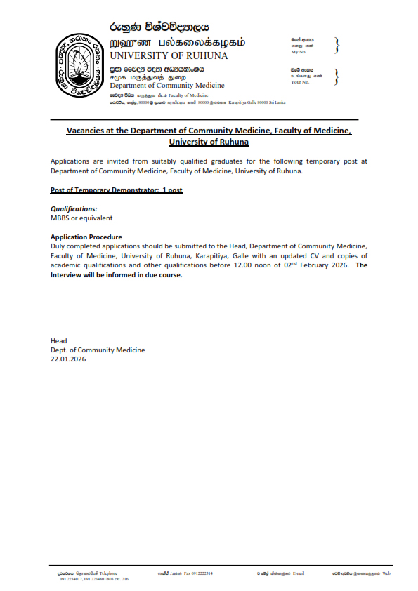 Post of Temporary Demonstrator ,Department of Community Medicine , Faculty of Medicine, University of Ruhuna January 23, 2026